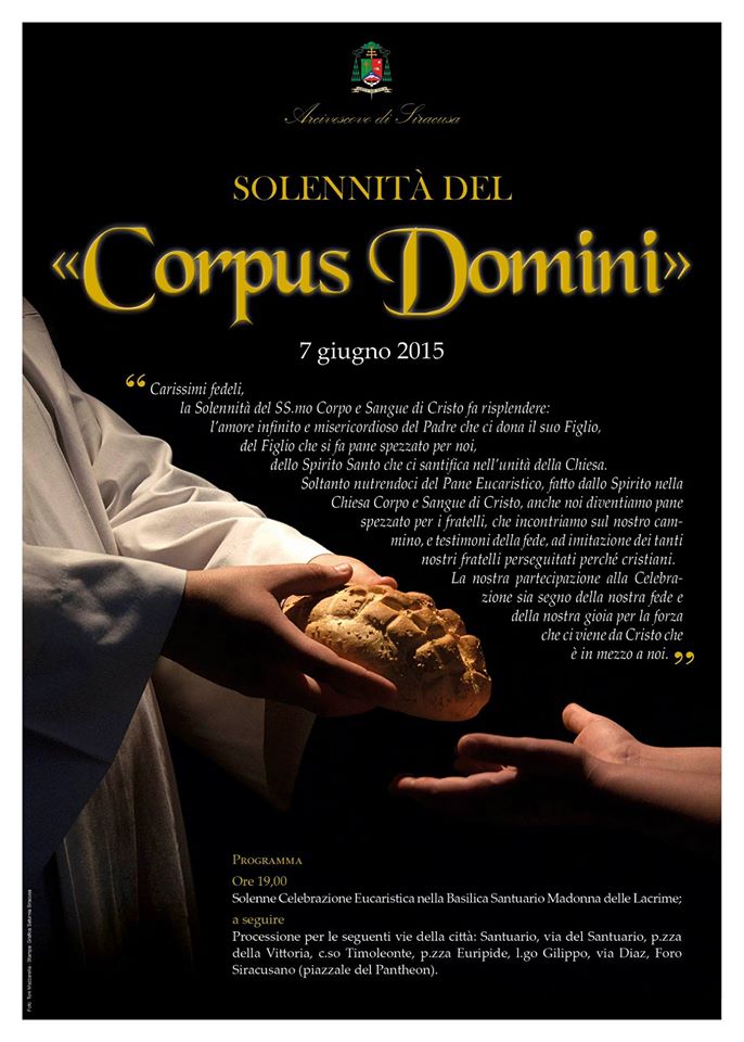 News Siracusa: sarà celebrata domani, alle ore 19 al Santuario della Madonna delle Lacrime, con una solenne concelebrazione eucaristica, presieduta dall’Arcivescovo Salvatore Pappalardo, la Sollemnitas Ss.mi Corporis et Sanguinis Christi (Solennità del Santissimo Corpo e Sangue di Cristo), alla presenza di tutto il clero del vicariato di Siracusa.