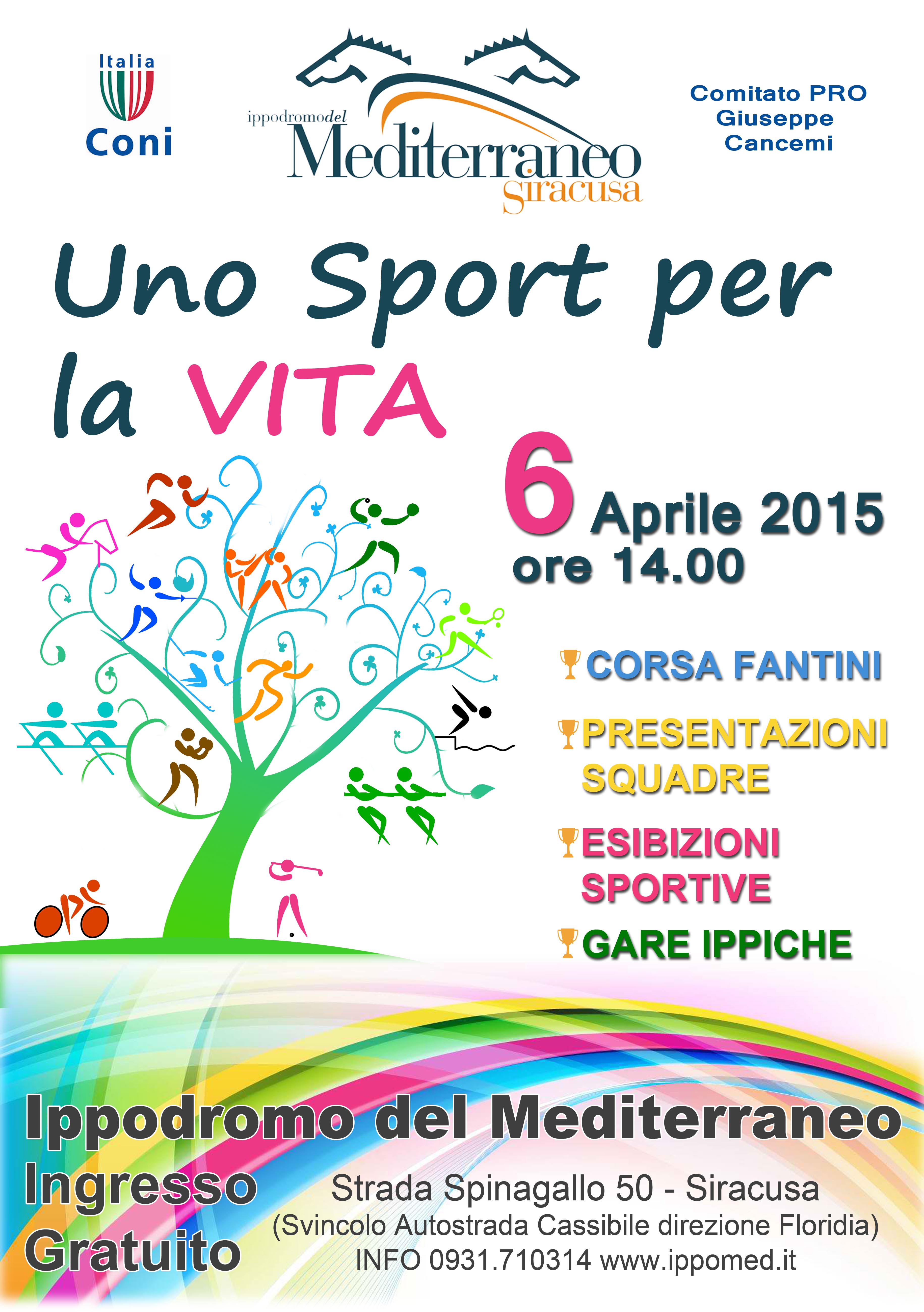 L’evento “Uno sport per la VITA”, organizzato dall’Ippodromo del Mediterraneo e dal CONI, si svolgerà nel pomeriggio del lunedì di Pasquetta, 6 Aprile, dalle ore 14.30 alle ore 18, presso la struttura ippica di contrada Maeggio-Spinagallo. La Syrako Rugby, che proporrà anche una sua esibizione, il calcio a 5 femminile con le Formiche, i campioni della Canoa, i corridori del Pattinaggio, il Circolo Canottieri Ortigia, la pallamano con l’Albatro, le ginnaste della Hobby Sport, i piccoli campioni della Team Nuoto, ma anche i più titolati atleti del tennis, delle bocce, del motocross. Tutti insieme, accompagnate da simpatiche cheerleaders, per un pomeriggio di solidarietà.