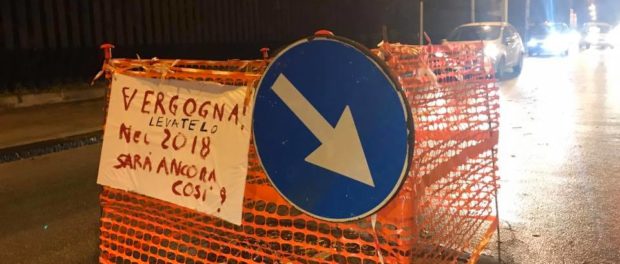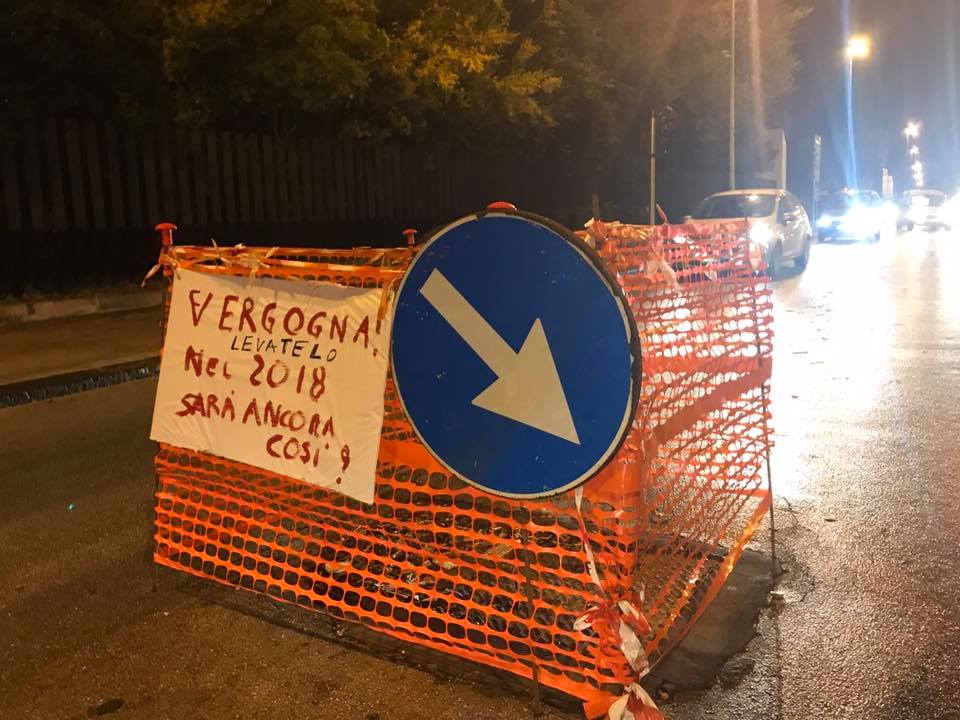 Si aggiunge la segnalazione di un curioso cartello affisso sulla rete protettiva che avvolge una buca “mai riparata” sulla strada. Nel cartello cui si legge “Vergogna! Levatelo, nel 2018 sarà ancora cosi?”. La grande buca, seppur recintata e segnalata da un segnale d’obbligo che ne prevede il superamento, causa grosse difficoltà durante le ore di punta del traffico, oltre il rischio di essere presa in pieno dai veicoli in transito. In attesa di eventuali lavori di rifacimento del manto stradale, la buca rimane solo un altro problema che si aggiunge alla precaria sicurezza di viale Teocrito.