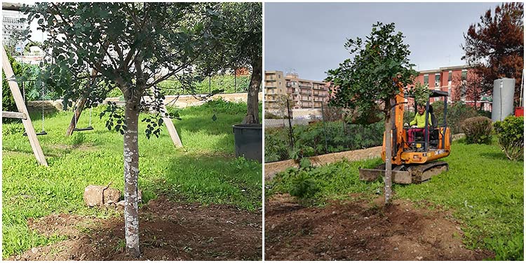 News Siracusa. Stamattina, nell’area che circonda il plesso Elio Vittorini di via Spagna/via Mazzanti, è stata effettuata la piantumazione di tre degli otto alberi adulti di carrubo estirpati tempo fa da via Bartolomeo Cannizzo.