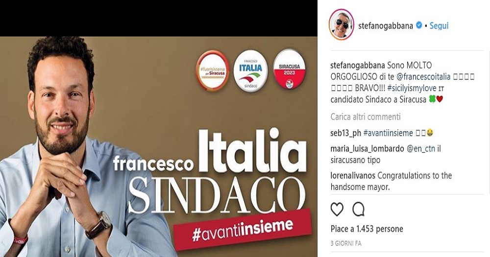 Stefano Gabbana, fondatore insieme a Domenico Dolce della omonima casa di moda Dolce & Gabbana, ha infatti annunciato il suo supporto alla candidatura a sindaco di Siracusa di Francesco Italia.