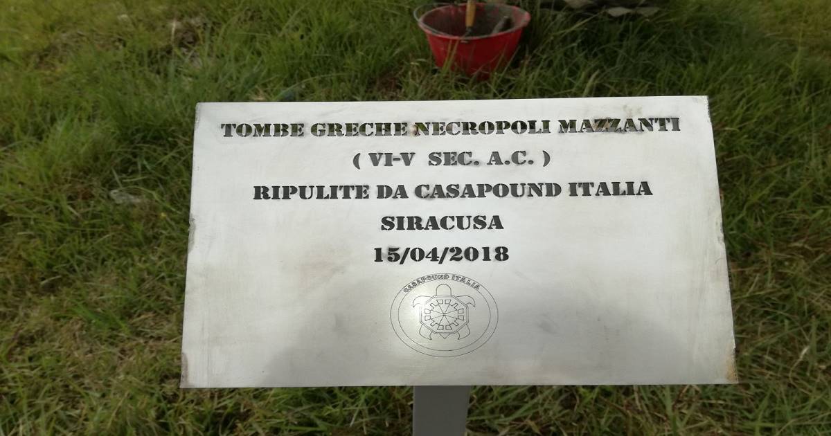 Siracusa. Questa mattina i militanti di CasaPound Italia Siracusa, si sono “rimboccati le maniche” e hanno ripulito e bonificato le tombe greche che si trovano in Viale Santa Panagia, nei pressi del tribunale, apponendo anche una targa descrittiva.