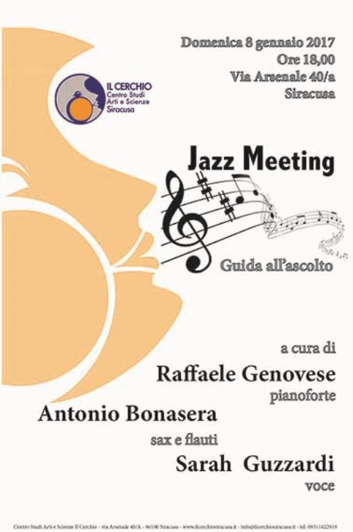 News Siracusa: condotti per mano nel magico mondo del jazz da Raffaele Genovese. Il maestro, coadiuvato dal sax e dai flauti di Antonio Bonasera e dalla voce profonda e calda di Sarah Guzzardi, domenica 8 gennaio, dalle ore 18 presso il Centro Studi Arti e Scienze Il Cerchio in via Arsenale 40/a, sarà protagonista dell’iniziativa didattica “Jazz Meeting: guida all’ascolto”.