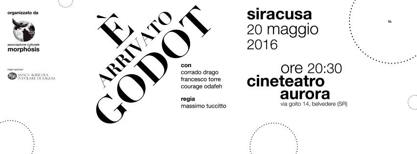 News Siracusa: Tutto pronto, la decennale attesa sarà ripagata. Venerdì alle 20,30 al cineteatro Aurora di Belvedere… “È arrivato Godot”. La riscrittura del capolavoro di Beckett – realizzata con l’aiuto di Gianpaolo Renello, docente di Letteratura all’Università di Salerno ed esperto di Informatica Umanistica e organizzata con l’associazione Morphosìs – sarà messa in scena dal regista e attore siracusano Massimo Tuccitto che salirà sul palco con l’allievo della Fondazione Inda Corrado Drago e la giovane attrice nigeriana Courage Odafeh.