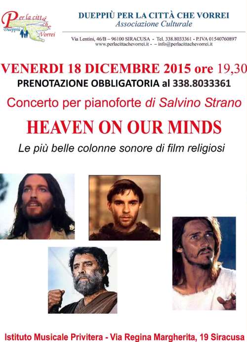 La musica al pianoforte sarà accompagnata da una proiezione di fotogrammi fissi e didascalie esplicative con immagini, tratte da grandi pellicole religiose, riguardanti la figura di Gesù, di San Francesco d’Assisi e di altri personaggi della tradizione biblica cristiana.