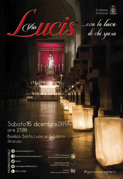News Siracusa: “Via Lucia. Con la Luce di chi spera” è il titolo dell’incontro dei giovani animato dall’Ufficio diocesano di pastorale giovanile dell’Arcidiocesi di Siracusa che avrà luogo stasera, a partire dalle ore 21.00, nella Basilica di Santa Lucia al Sepolcro, a Siracusa. Ai piedi del simulacro della patrona, Santa Lucia, seguirà una notte di adorazione con l’esposizione del S.S. Sacramento con inizio a mezzanotte sino alle lodi mattutine.
