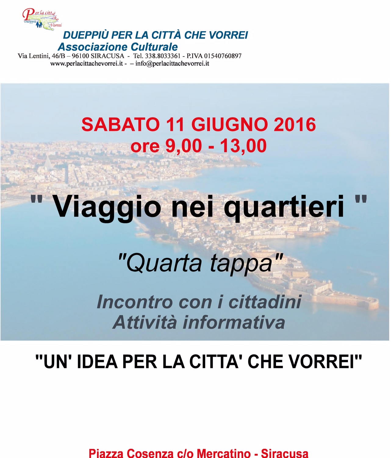News Siracusa: l’associazione Per la città che vorrei sarà presente sabato, dalle 9.30 alle 13.00, in piazza Ernesto Cosenza zona Pizzuta, quartiere Tiche, con un gazebo dove verranno svolte “attività informativa, laboratori didattici aperti a tutti ma soprattutto continueremo l’attività avviata alle scorse tappe, ovvero la raccolta delle idee e delle opinioni dei siracusani, mediante un coupon “Un idea per la città”, in ogni tappa che faremo chiederemo ai cittadini di esprimere la loro opinione sulla cosa pensano di Siracusa, dei suoi servizi”: come racconta il presidente Sergio Pillitteri.