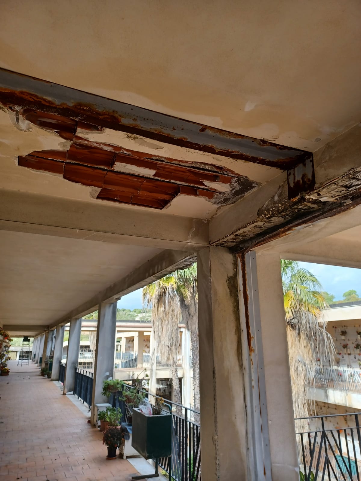 Intonaci staccati, ferri dei pilastri scoperti, cornicioni staccati e lastre di marmo a terra qua e là.