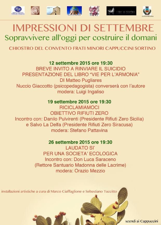 La manifestazione, in collaborazione con i Frati Minori Cappuccini di Sortino, il Servizio “Giustizia, Pace, Integrità del Creato” dei Frati Minori Cappuccini di Siracusa, la Banca Agricola Popolare di Ragusa, il Comune di Sortino (SR), l’Associazione culturale “I libri di Morfeo”, “Progetti di Armonia”, “Dissensi Edizioni” ed arricchita dalle installazioni artistiche curate da Marco Ciaffaglione e Sebastiano Tuccitto, prevede una serie di incontri-dibattito con ospiti d’eccezione. Di seguito, proponiamo l’intero programma di “Impressioni di Settembre – Sopravvivere all’oggi per costruire il domani”.