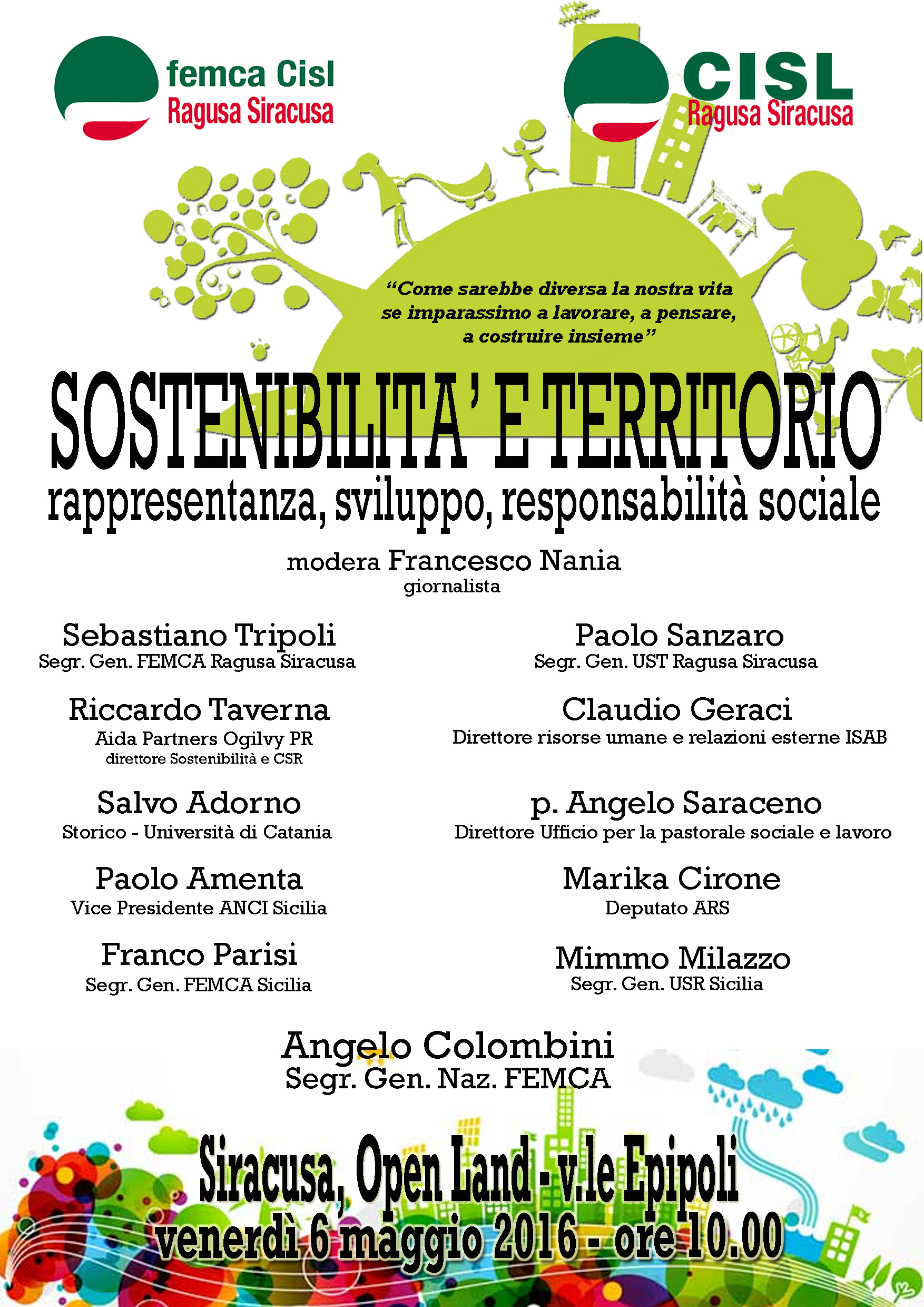 News Siracusa: “Sostenibilità e Territorio”, questo il tema scelto dalla UST e dalla Femca Cisl di Ragusa Siracusa, per la tavola rotonda in programma venerdì prossimo, 6 maggio, a partire dalle ore 10, nel salone Open Land di viale Epipoli.