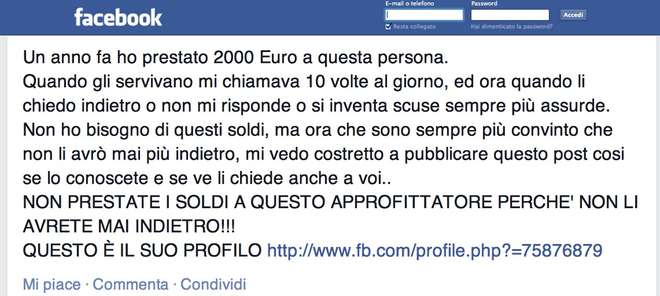 IL POST: “Un anno fa ho prestato 1000 Euro a questa persona. Quando gli servivano mi chiamava 10 volte al giorno, ed ora quando li chiedo indietro o non mi risponde o si inventa scuse sempre più assurde. Non ho bisogno di questi soldi, ma ora che sono sempre più convinto che non li avrò mai più indietro, mi vedo costretto a pubblicare questo post cosi se lo conoscete e se li chiede anche a voi.. NON PRESTATE I SOLDI A QUESTO APPROFITTATORE PERCHE’ NON LI AVRETE MAI INDIETRO!!! Questo è il suo profilohttp://www.fb.com/profile.php?=75876879″
