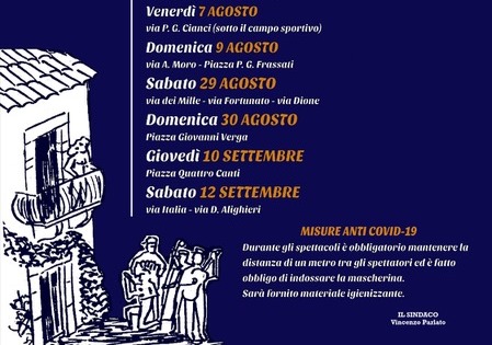 Quattro gli appuntamenti ad agosto: il 7 sotto il campo sportivo di via Cianci, il 9 tra via Aldo Moro e piazza Frassati, il 29 tra via dei Mille, via Fortunato e via Dione e il 30 in piazza Giovanni Verga. Si chiude giovedì 10 settembre in piazza Quattro canti e sabato 12 tra via Italia e via Dante Alighieri.