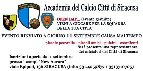 News Siracusa: Si terrà il prossimo 11 settembre dalle ore 17 alle 18,30, nei campi Aurora di Viale Epipoli, il primo “Open Day” organizzato dall’Accademia del Calcio del Città di Siracusa.